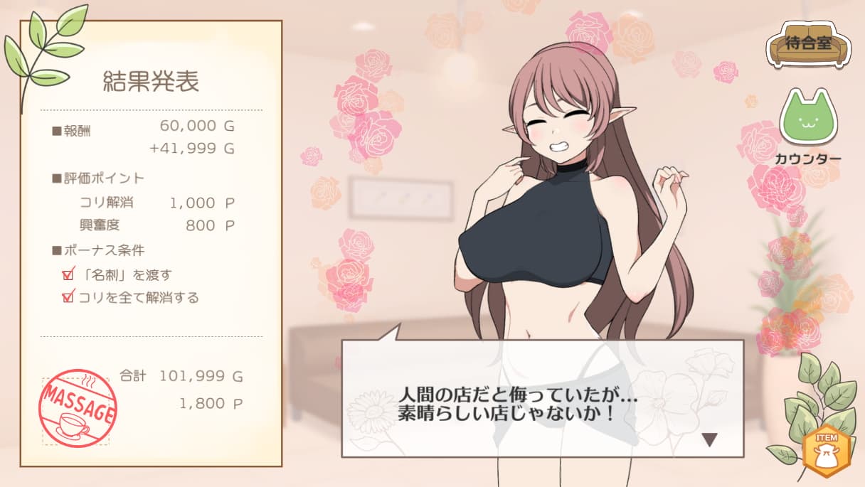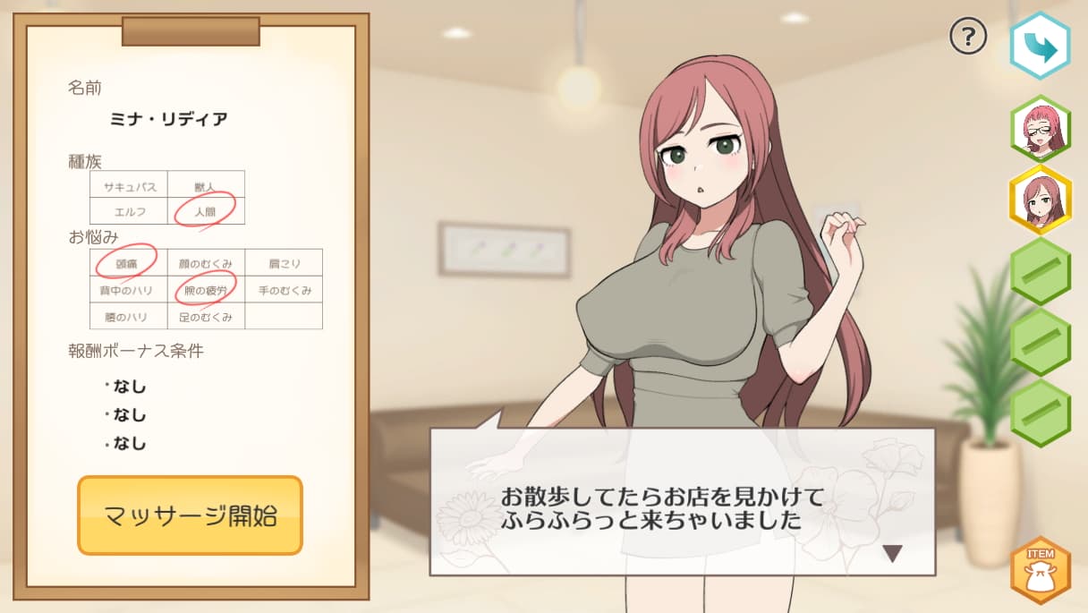 ランダム生成されるマッサージ客の女の子の身体の悩みを解消させ、ついでに性感帯を刺激してエッチな施術も行っていこうというマッサージ店経営SLG。