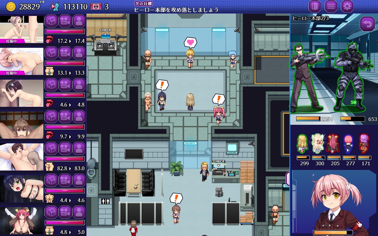 画面の左右はオートで進行しているイベントで、左では特定の男優と同棲エッチして種を仕込んでもらったりエロステータスが上がっています。画面右は生み出した怪人を出撃させてヒーロー協会の拠点なんかを襲撃しているバトル画面ですね。怪人作成はガチャシステムになっていて、強力な怪人を仲間にするために何度も左の子らに子供を産ませていくという、AV撮影というエッチ要素がゲーム攻略の根底に根差しているものです。また、男優も多数登場しておりヒロインとの愛の巣に組み入れた時の初回の会話や、フリー種付けAV撮影といったどの男優を選んだかで変わるエッチイベントも会話差分が変わるという凄まじい仕様になっています。正直なんで1年でこの作品が出来上がるのか理解不能なレベル。