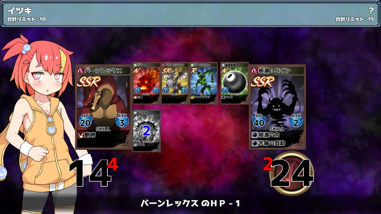| 根源:ペインEs | HP50 ATK3 攻撃タイプ 苦痛の鼓動[発動回数1]HPが10以下になった時、相手に7ダメージ 根絶への抵抗[発動回数∞]ATKが2以下になった時、ATKが3になる ペイン[発動回数∞]自分のターン開始時、相手に1ダメージ(CT1) |