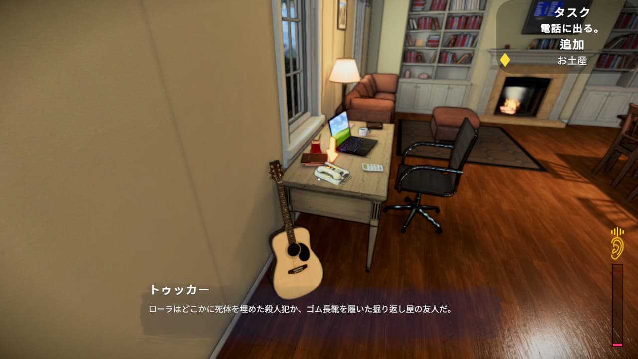 プレイヤー視点ではコメディチックなものになっていますが、ローラ視点だと家中から物音が聞こえてくるホラー調ですよね。色々誤魔化したりローラと接点を保つためタッカーは「この家の前の住人の幽霊だ」みたいなことを嘯きます。幽霊なんかいねぇよハハ全てタッカーの自作自演なんだわ。