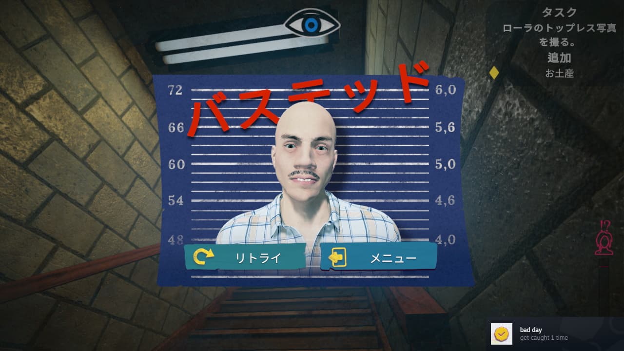 1つは結構ゲームとして楽しいという点。ターゲットのローラは家の中を巡回したり特定の行動を取ったするんですけど、その隙を突いて盗撮を行ったりだとか、秘密のアイテムを見つけるというようなストーキングシミュレーター要素がまず面白かった。視界に入ったら即ゲームオーバーとかではなくて屈んで物陰に隠れると助かることがあるのはゲーム的です。見つかってもそのミッションの最初からになるだけでした。