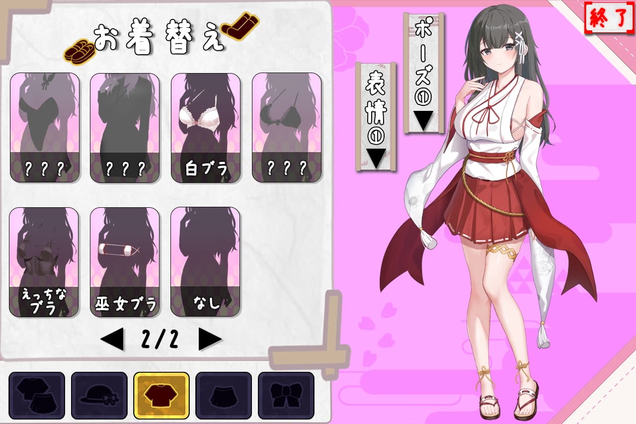 おさわり時や普段の格好に指定できる着せ替えの衣装も充実しています。デフォルトの巫女衣装からしてだいぶ攻めた格好ですが……まあ何着ても似合うですけどオーソドックスな制服衣装とかが個人的には結構お気に入りすね。これら着せ替え衣装はそれぞれ対応するエッチシーンなんかもあり着エロの七変化も面白いところです。