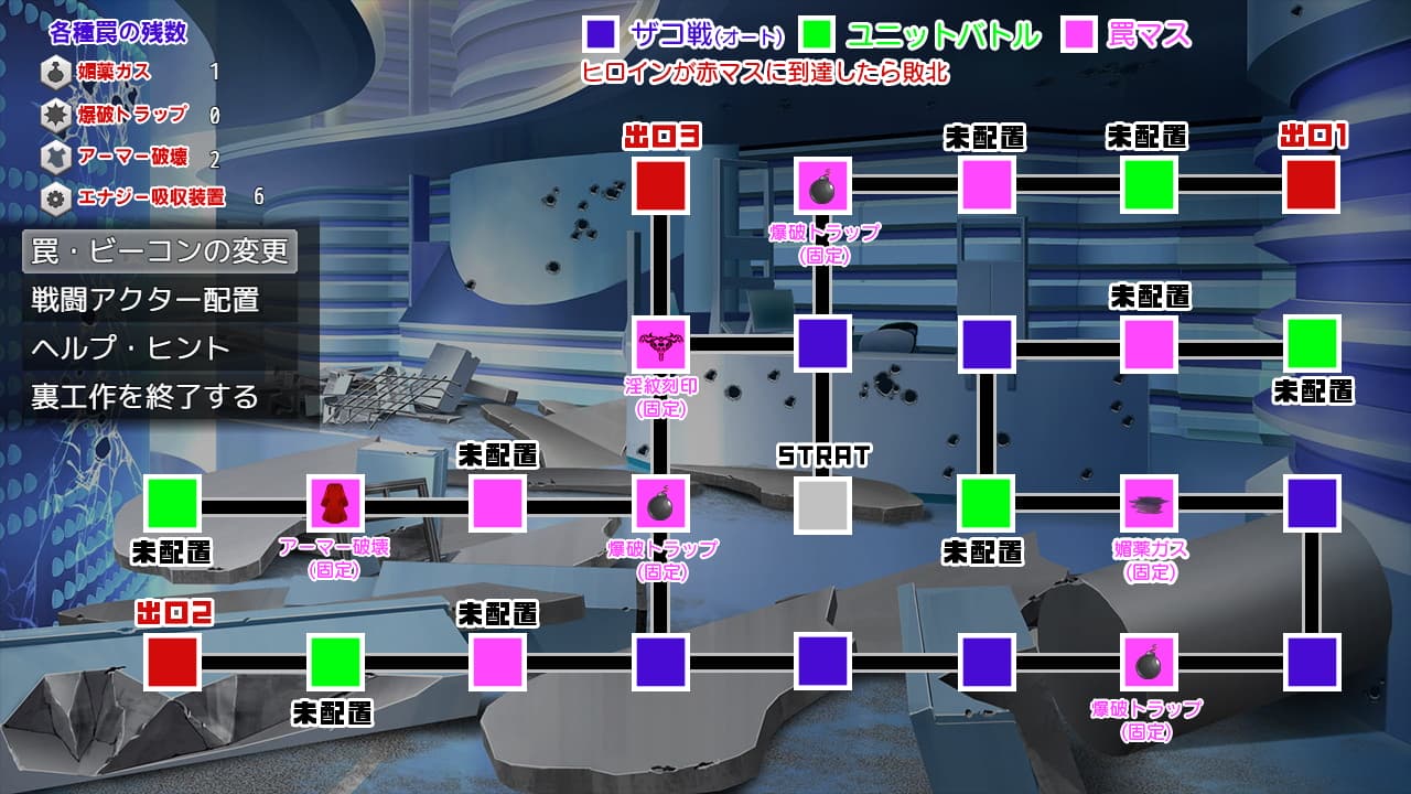 裏工作時の説明にあるように罠2方向にビーコンを設置すると淫紋付与イベントが発生します。ただしこのルート戦闘は最大2回しか発生しないので、淫紋マスと指令室前(保険)に人型クリーチャーやハウザーを配置しましょう。もちろん拘束エロを見たいユニットでも可。