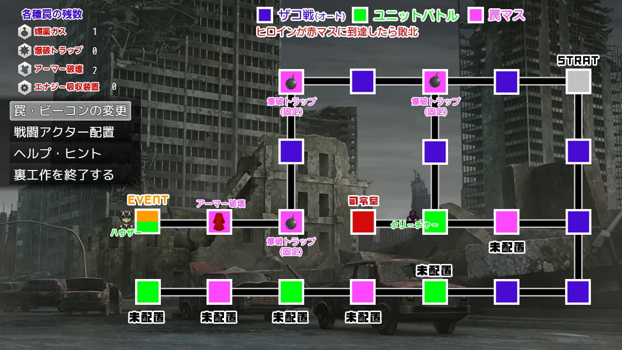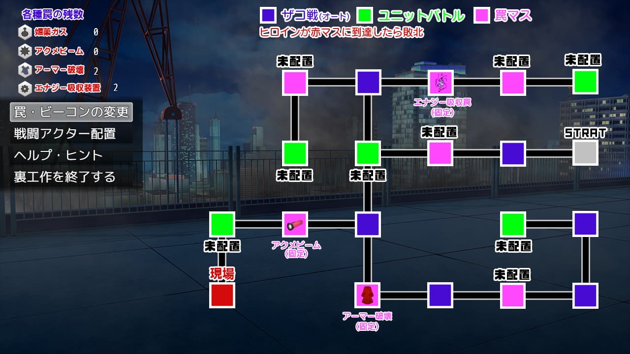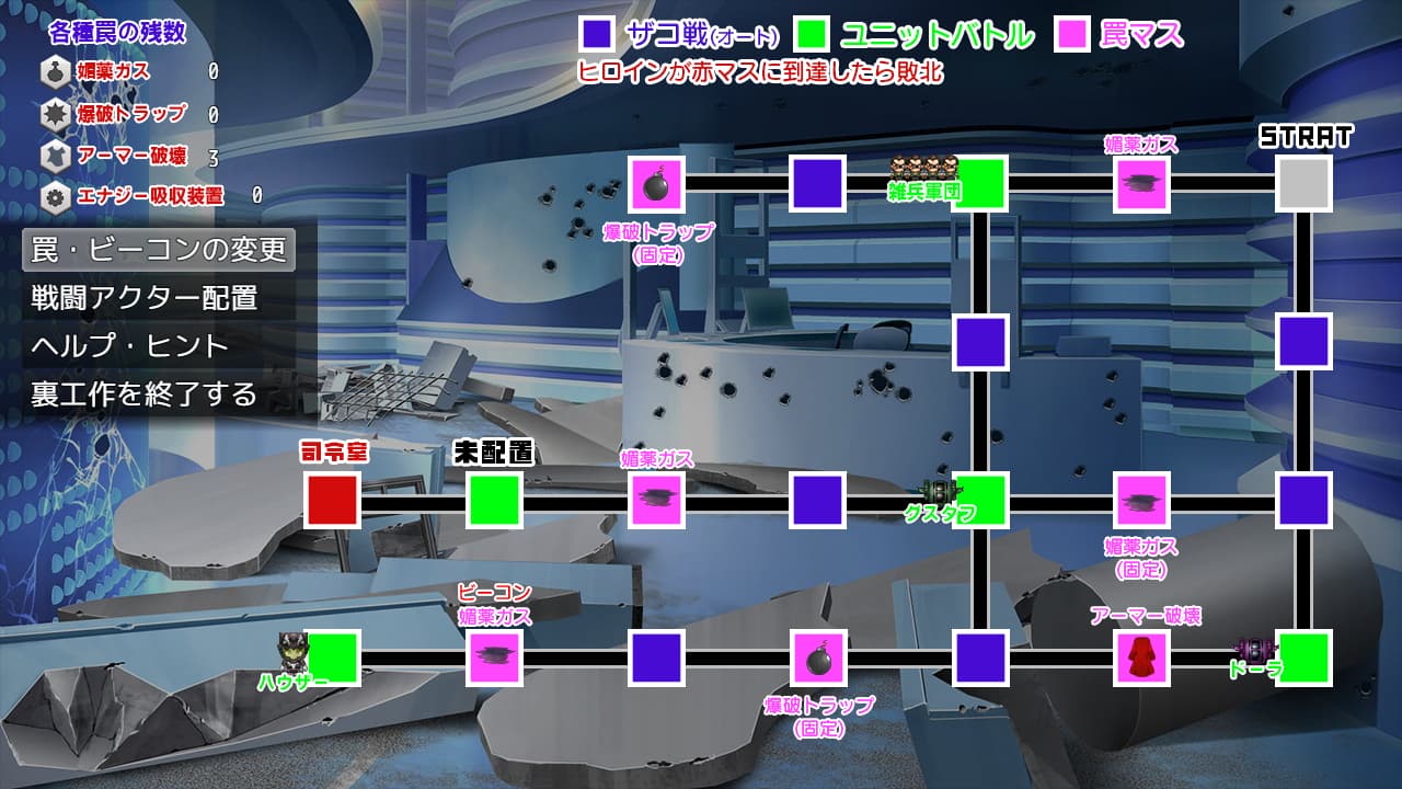 本作各作戦によって配置できるキャラクターが異なり、マップの特性や罠を活かしてクロエの進撃を止める必要があります。回想ではスカウト済みのユニットの戦闘エロが記録されているので勝つことを優先してよいでしょう。