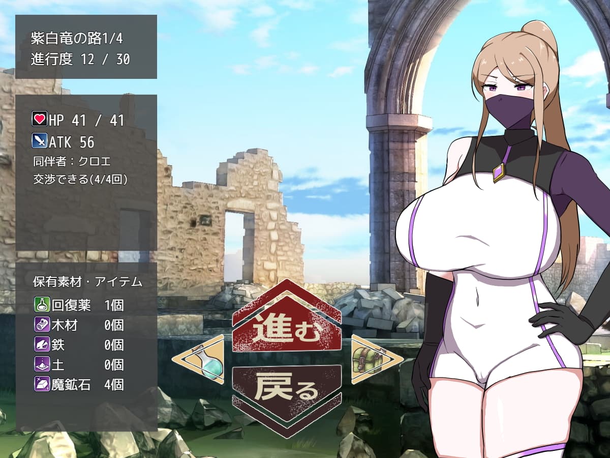帝国の支配によって抵抗できなくなってしまったため仕方なく資材集めを開始する2人。モルガンはクロエの過去を知る人物でもあり、「男の性欲に反応して発情させ、ついでに戦闘力も削ぐ淫紋」にも詳しい。帝国兵や村人の性欲処理をさせられるクロエがどんどん堕落していくのをユウは歯嚙みしながら知らんぷりするしかない……そういうストーリーのゲームです。