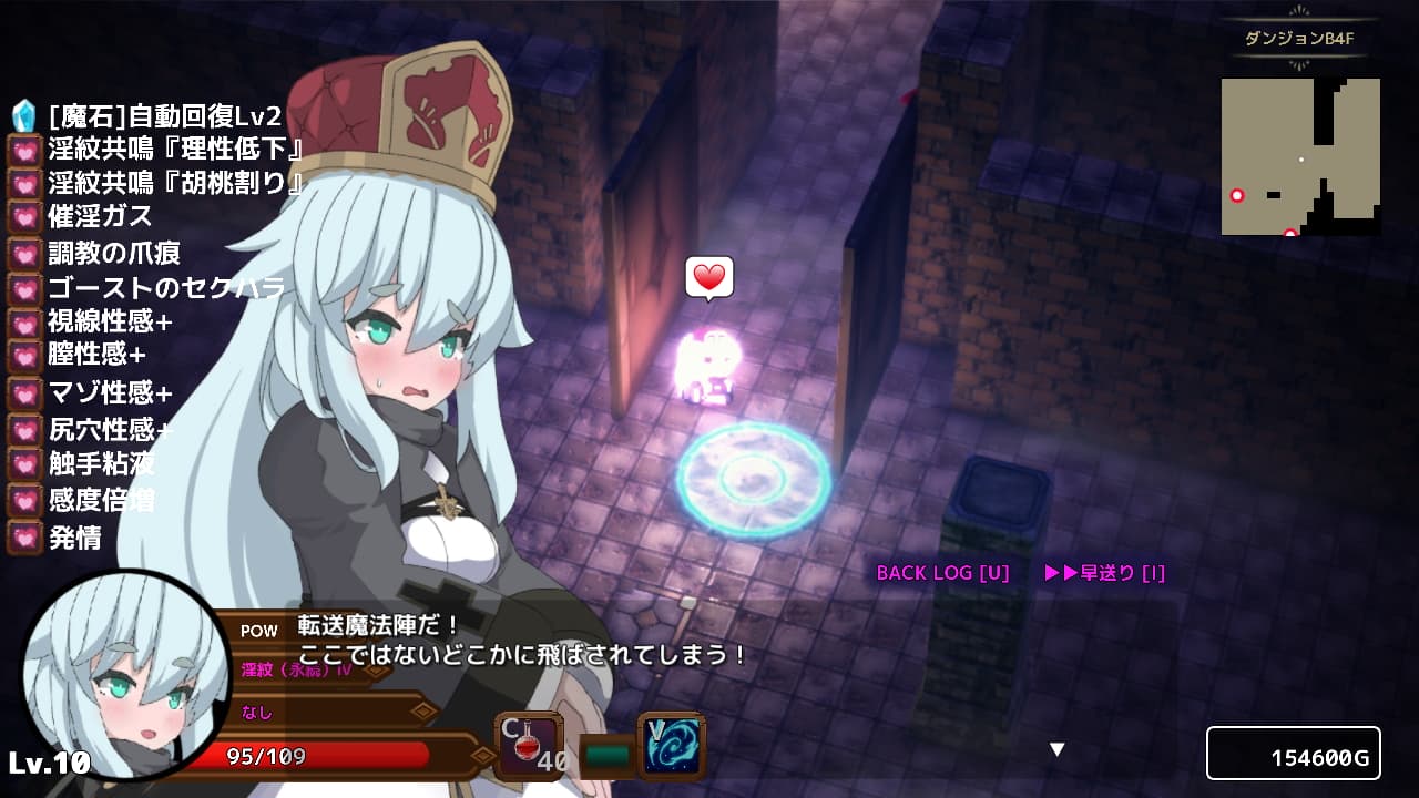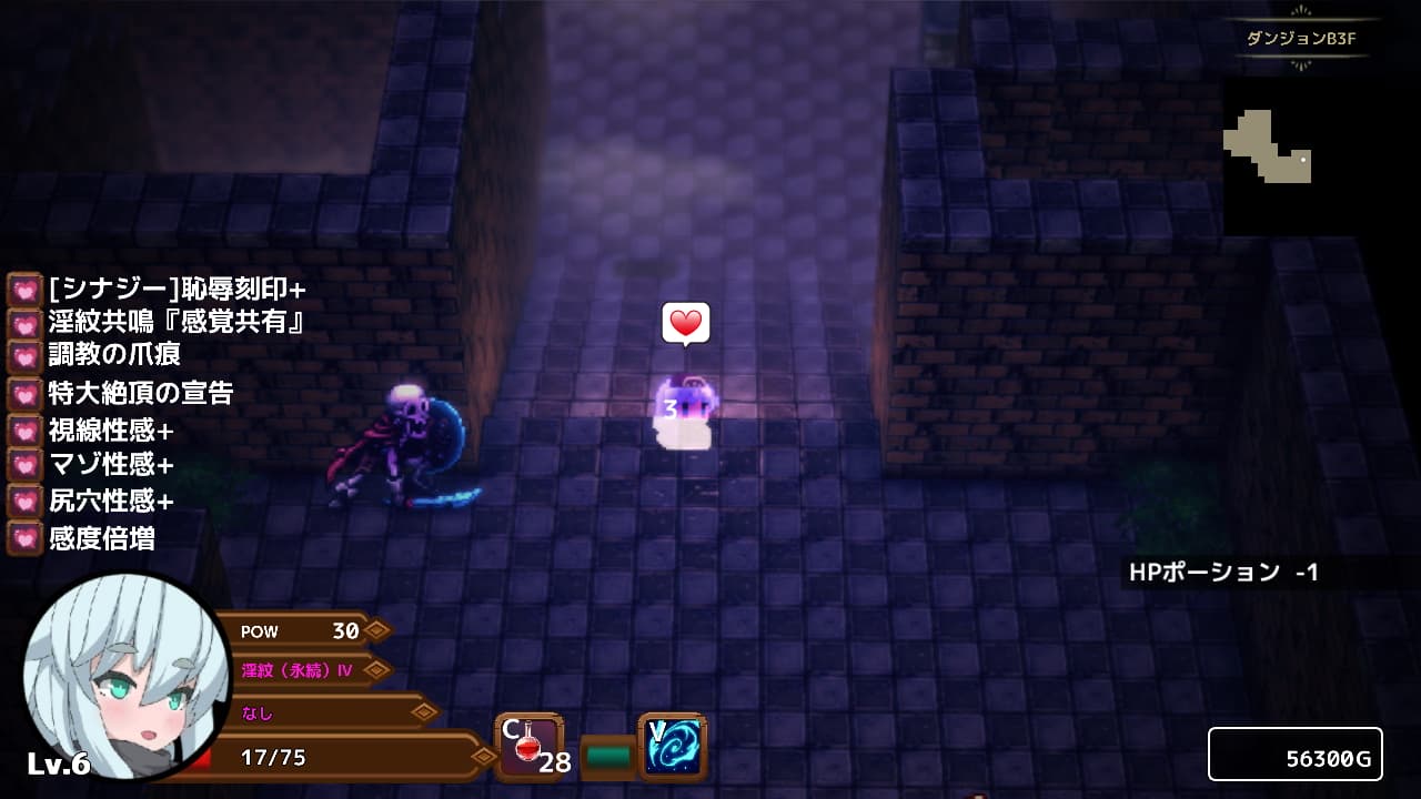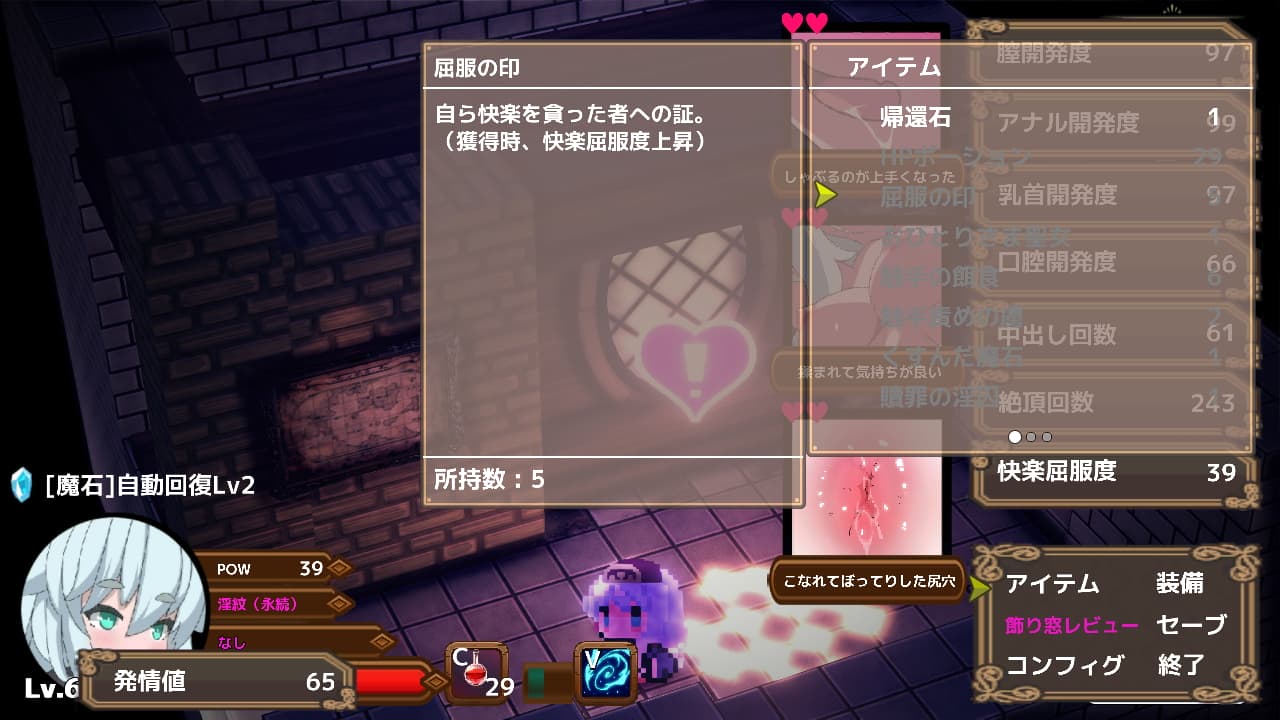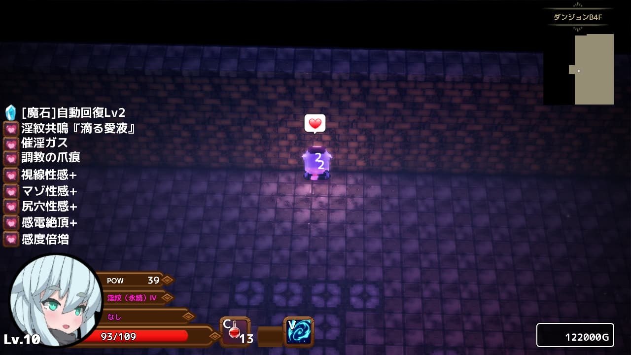 基本的にダンジョンはポーションがぶ飲みで進んでいきます。時間経過でエロ系のバステは剥がれますけどDotダメージ的にHPが減っていくのでいかにこの性的な疼きが彼女の身体と心を蝕んでいるかわかりますね。ちなみに魔石を装備するとリジェネが発動するので軽度のエロ後遺症ならカバーできますね。