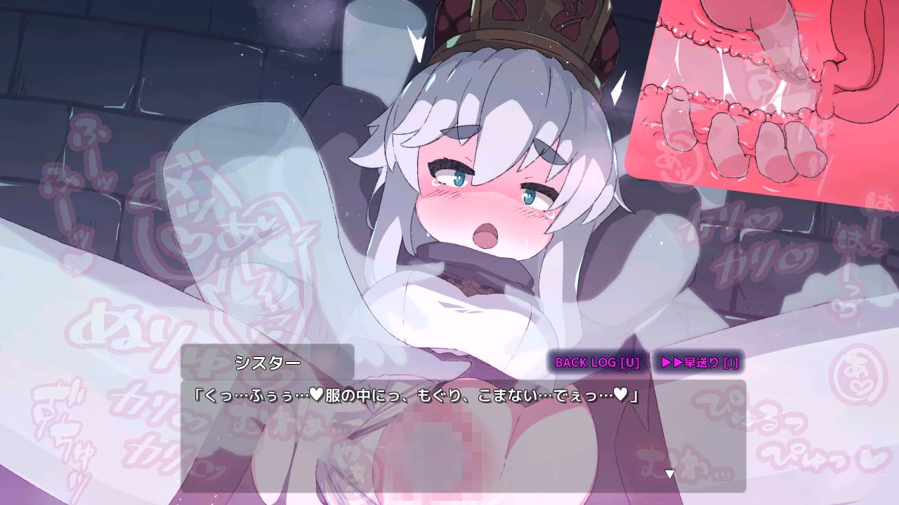 卑怯なサキュバスに「淫呪のクリスタル」を取ってこいと命令され、淫紋を付与されてしまい抵抗することができなくなってしまった主人公のシスターがエロトラップだらけのダンジョンを探索したり、淫紋の侵食をリセットする為に街で売春するゲーム。