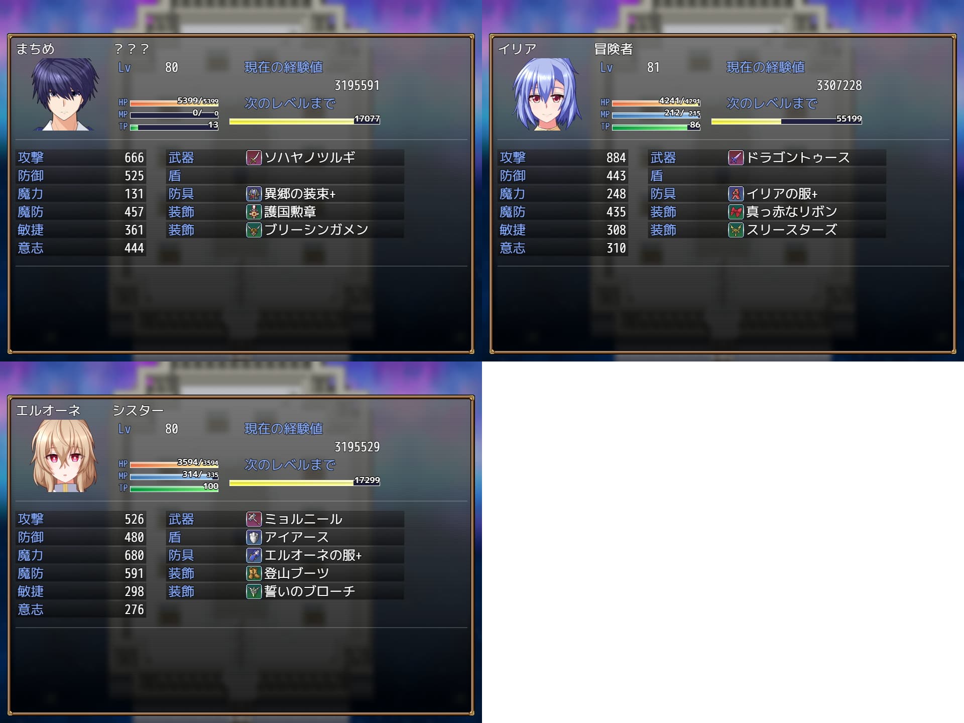 ラスボスと同じ主人公・イリア・エルオーネのPTで、装備はエルオーネに登山ブーツを装備させています。