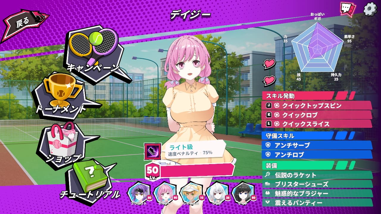デイジーは菊丸英二でゲーム内最も機動力の高いキャラの代わりに持久力に乏しいというもの。装備でカバーしても良いですし持久は捨てて力や技を伸ばしてあげても面白いかもしれませんね。