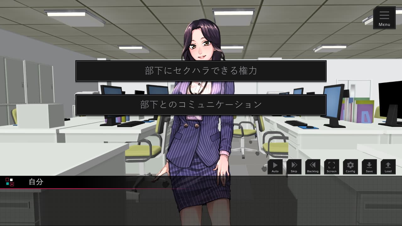 セクハラ厳禁の一般企業で部下に自分に対する慰安の仕事を持ち掛けるという設定。メインヒロインは課長代理で上昇志向が強い朝井美桜(名前変更可能)でサブヒロインは現代社会の悪意に食い物にされて常に金欠な夢追う派遣社員の神庭涼子。どちらもプライベートがグダグダです。今は1000円で買える手頃な作品で、結構楽しかったのでおすすめです。