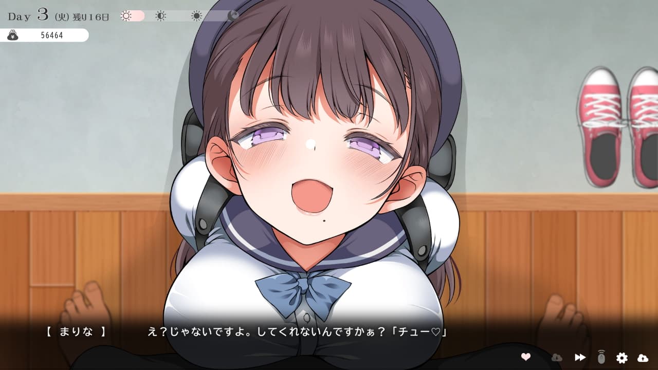 というのが本作のトゥルーエンドに至るまでの話で、まりなに乗せられてエッチなことをしてしまうとバッドエンドに分岐してしまいます。不幸な結末を避ける唯一の方法は、プレイヤーが他の男とは違うんだと行動で示すこと。つまりこの小柄な身体に不釣り合いの爆乳なんかには屈さず、まりなの良きパートナーとして3週間耐え続けなければなりません。