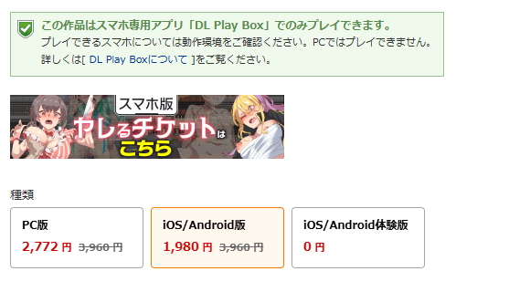 作品タイトルに【Android版(APK版・スマホプレイ版)】や【DL Play Box版】と表記があります。前者は購入後にお使いのスマートフォンにゲームのデータを直接インストールしてアプリとして起動して遊ぶもので、後者はアプリストアでDL Play Boxをインストールしておき、アプリからDLsiteにログインすることで購入した作品を遊ぶものという違いがあります。DL Play Box専用の作品も結構あるのでAndroidユーザーもアプリの準備しておいた方が良いでしょう。