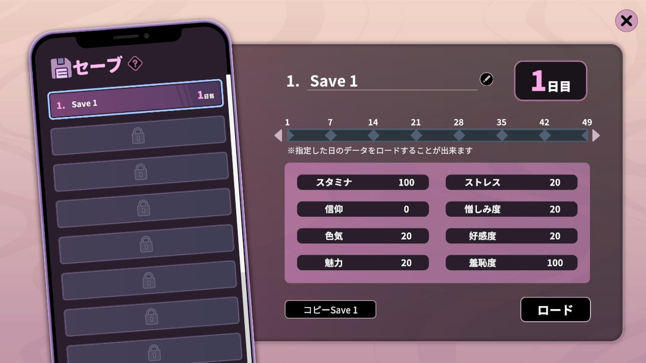 エンディングが沢山あるから大変と言えば大変だけど、セーブが高機能でね。毎日オートセーブされて好きな日から再開する機能とセーブスロットをコピーする機能がある。