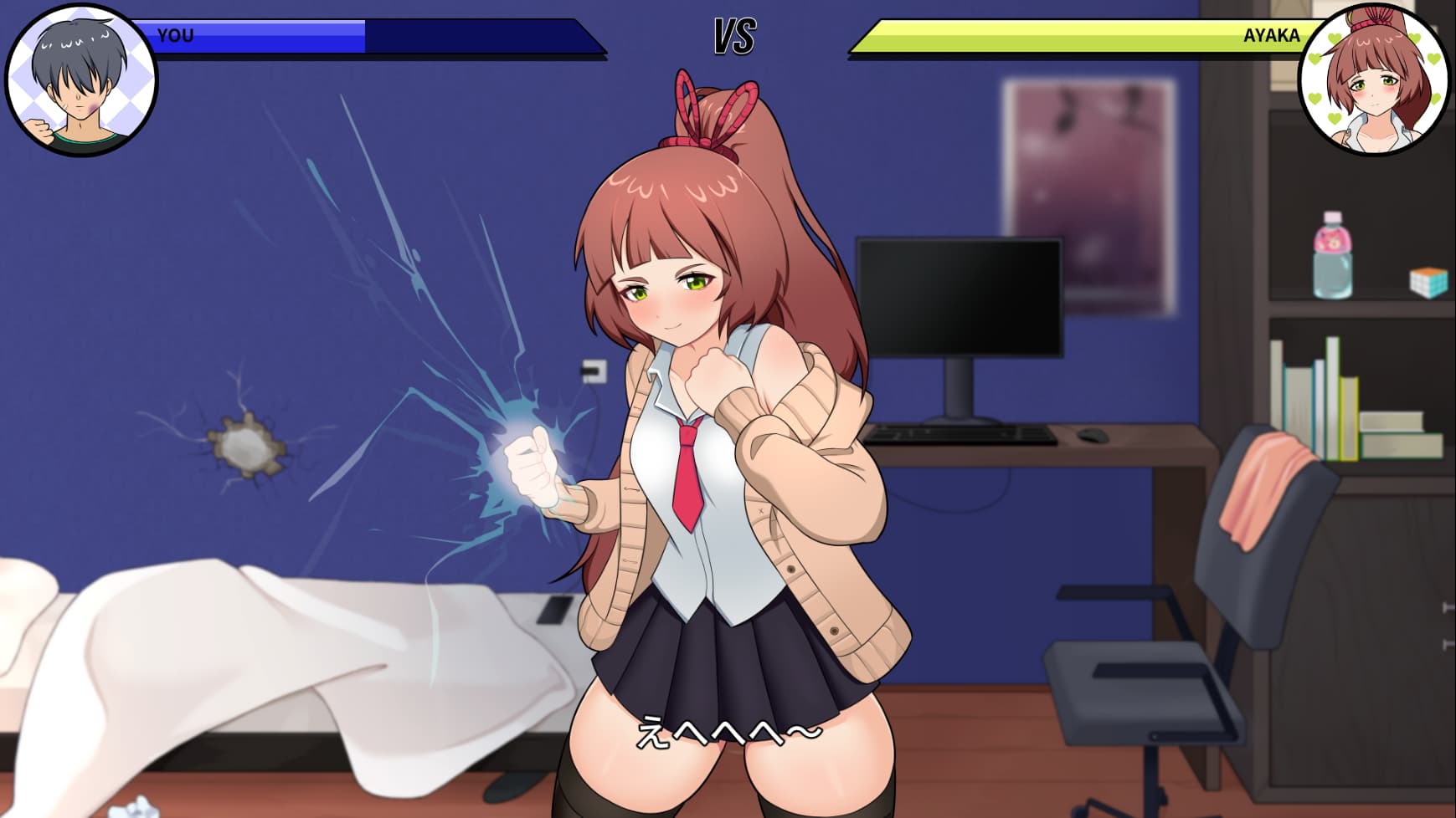 本作はこんな感じの主観視点で対戦相手の女の子が様々な技を繰り出してくるので、キー入力(WASDや矢印キー、マウス等)で適切なコマンドを入力してひたすら攻撃を防いでいくというものです。ゲームパッドにも対応しています。
