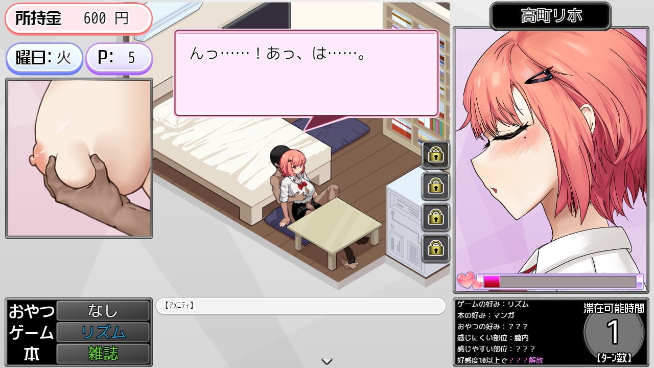 - 好感度10以上:エッチ実行で滞在ターン増加イベント&性器愛撫&ヒロインが読書をするようになる