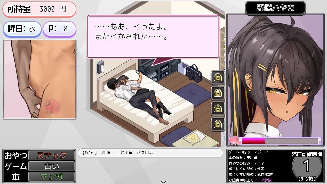 - 好感度30以上:エッチ実行で滞在ターン増加イベント&ヒロインがトイレを使用するようになる