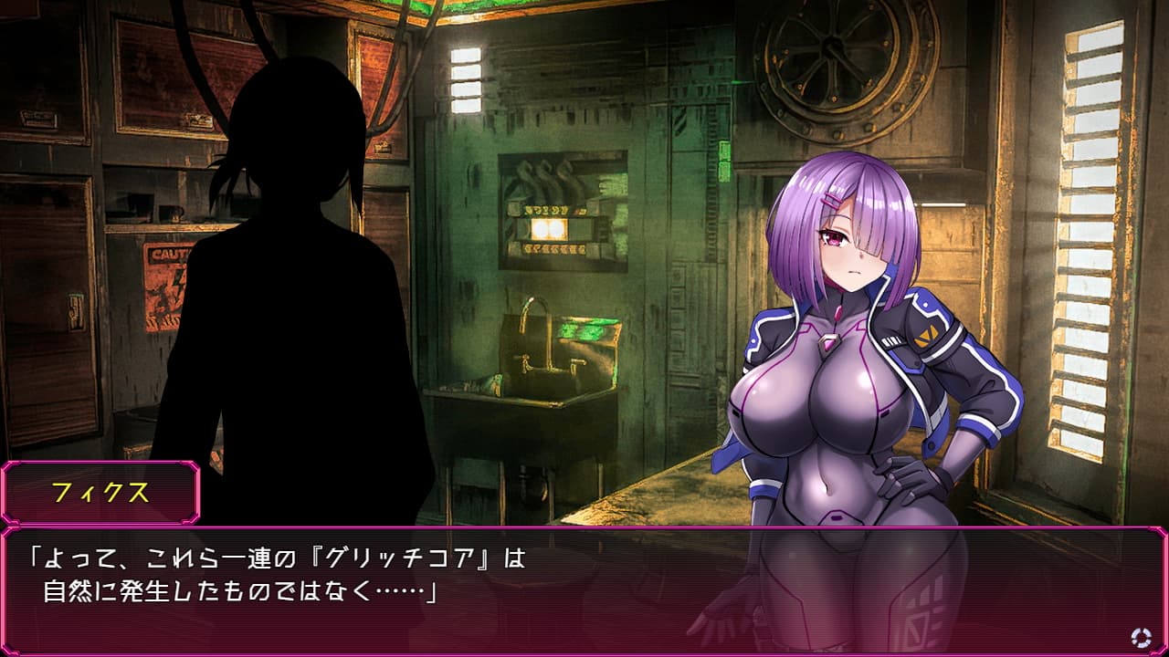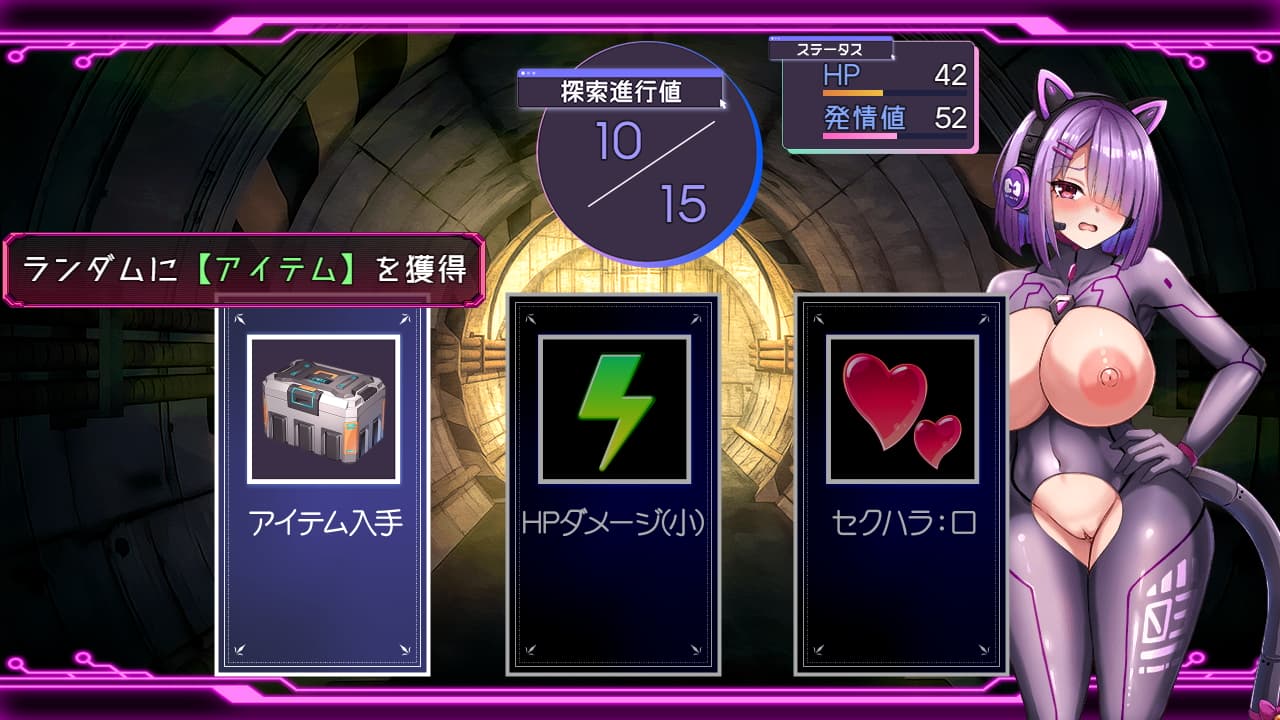 本作戦闘はありませんが探索進行値を1進めるごとに出現する三択のイベントでフィクスのHPが減る場合があり、この探索イベント中にセクハラと敗北エロが発生する形になっています。依頼では対人系のエロRPGイベントが発生するのが嬉しいですね。一応成長要素があるので稼いだお金でアイテムを買い各種ステータスを伸ばしていくと探索が少し楽になります。一般的なRPGと違って本作はインターネット空間にダイブする設定からかステータスの名称も電脳とか精神とかそういうサイバネティックな感じに変わっていました。