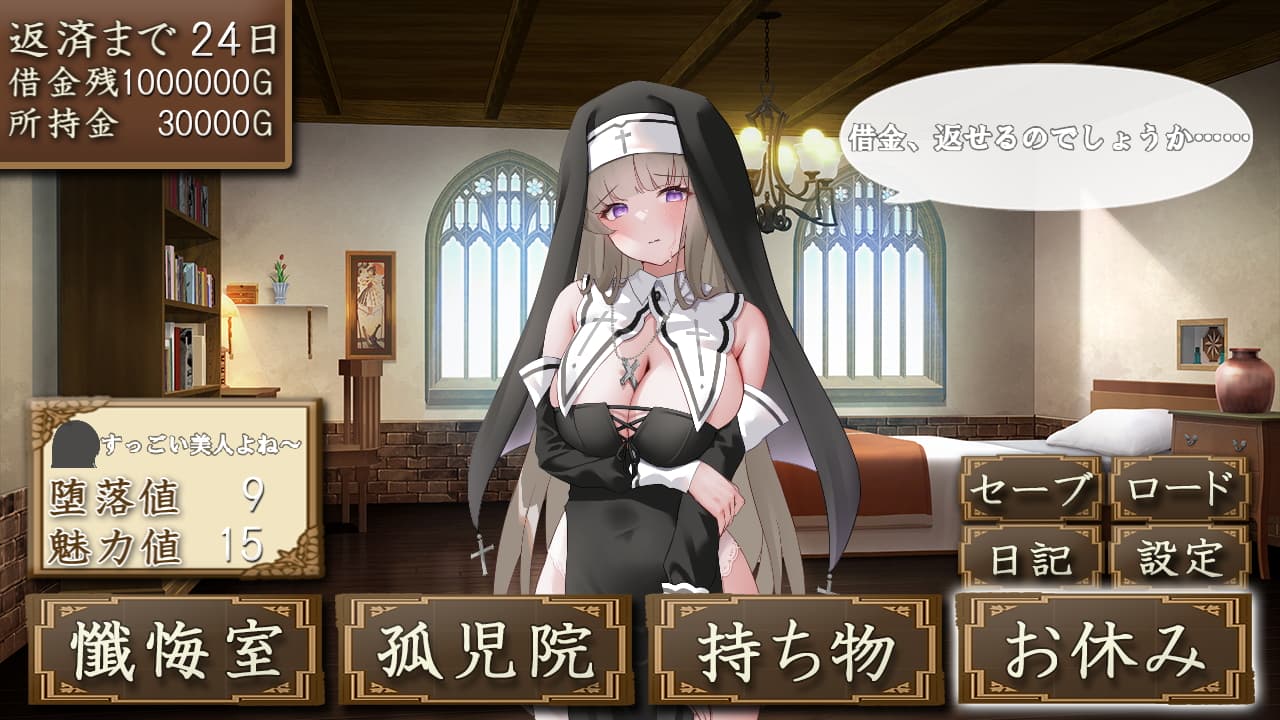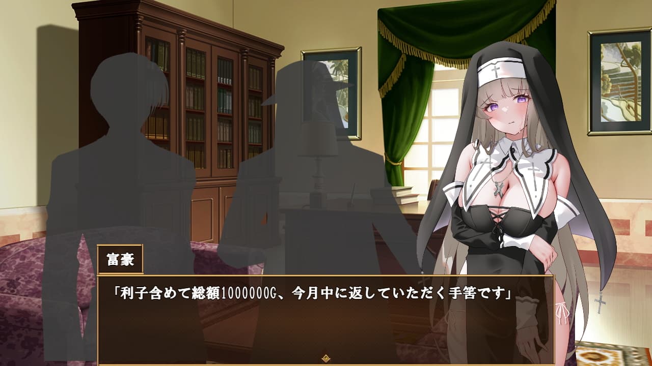 新米シスターの借金返済SLG。勤務先の教会が火事の復興の為に街の富豪に借金をしているのだとか……。
