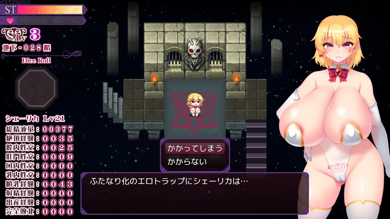 ダンジョンを潜っていく過程で付与される場面が訪れると画像のようにふたなりの場合は選択肢で、膨乳の場合は迂回路を通ることで適用するかどうか選べるのでこれらの属性はプレイヤーの好みでシェーリカに添加できるようになっています。