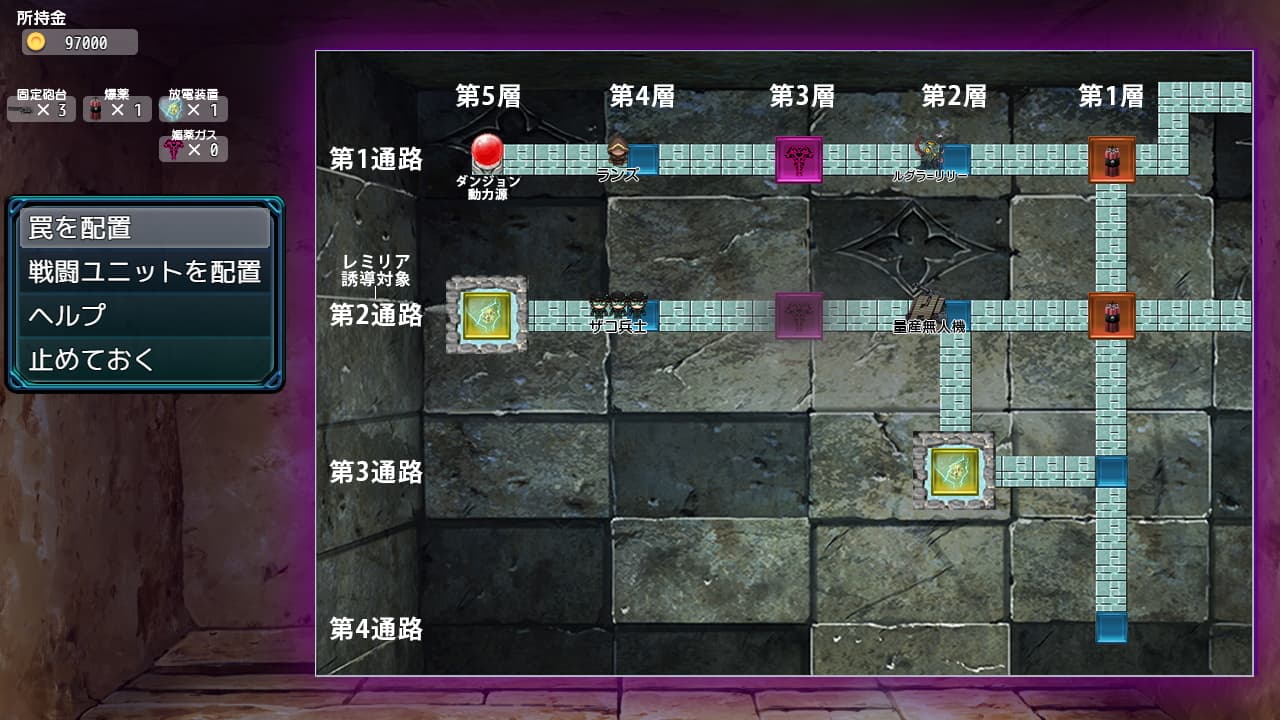 - 第2通路を拡張するのが良いと思います。前作をやっている方であれば理解が早いですが雑魚とトラップを配置しまくりレミリアの「MP」を枯渇させ、レミリアに勝つというイメージです。
