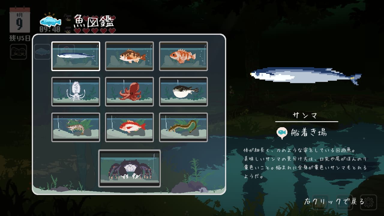 魚図鑑は島に4つある釣りポイントで釣りをしていればおのずと完成します。時間帯などは関係なく、ポイントで釣れる魚が決まっています。