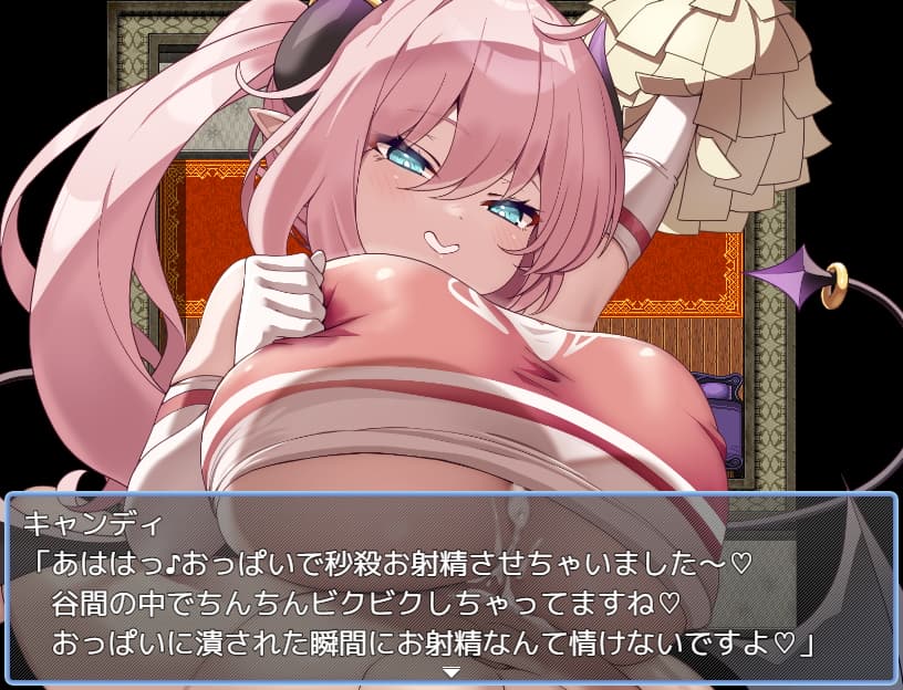 エッチシーンはほぼパイズリでありセックスは無し。女性上位のシチュエーションですけどヒロインの半数ほどに馬乗りパイズリのシーンがあって、誘い受けの形で翻弄されるプレイが特に好みでした。ステータスを見ると主人公はLv60なので普通に戦ったら強いみたいですがここは淫魔の胃袋の中。ということで一度沼に嵌ってしまうとズルズルとエッチなサキュバスの魅力に抗えず屈してしまう無様な射精を繰り返してしまうロールプレイが楽しめるんじゃないでしょうか。