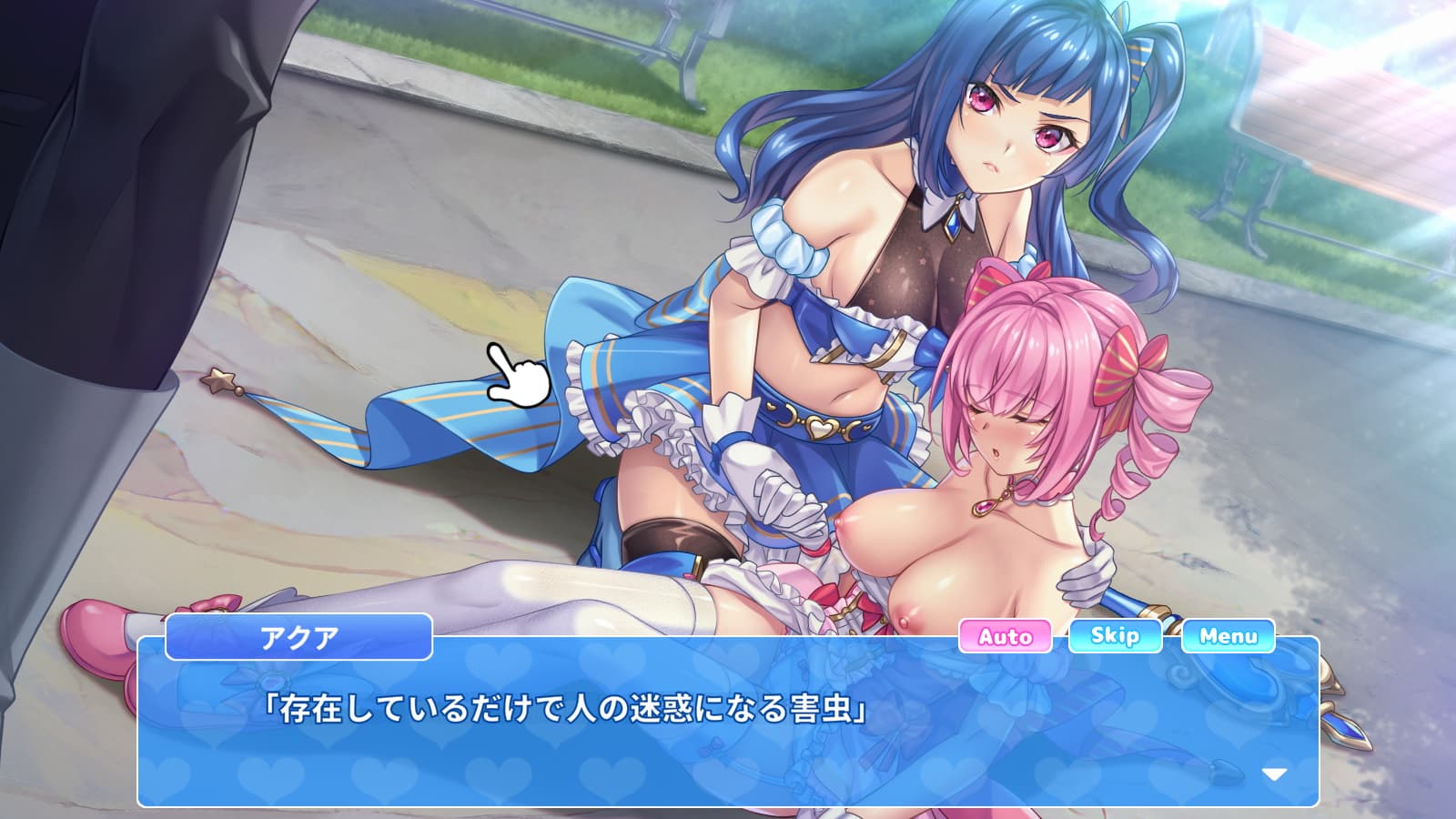 アクアの性格や性癖が起因してむしろ完堕ち前のエッチシーンが楽しい。本作は射精時に選択肢で部位が選べる場合があり、特に序盤のアクア凌辱シーンでは口では抵抗するが敵に負け屈辱を受けるというシチュエーションに他ならぬアクア本人が興奮を覚えていてまさに口だけの抵抗をしつつ快楽と絶頂の波に呑まれる姿がとてつもなくエロいです。