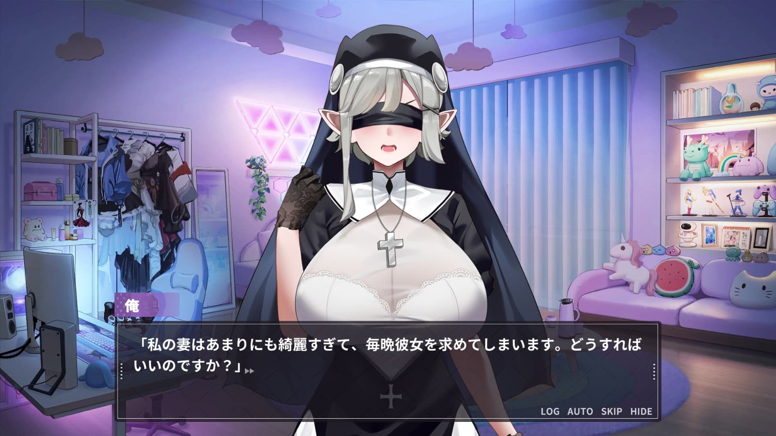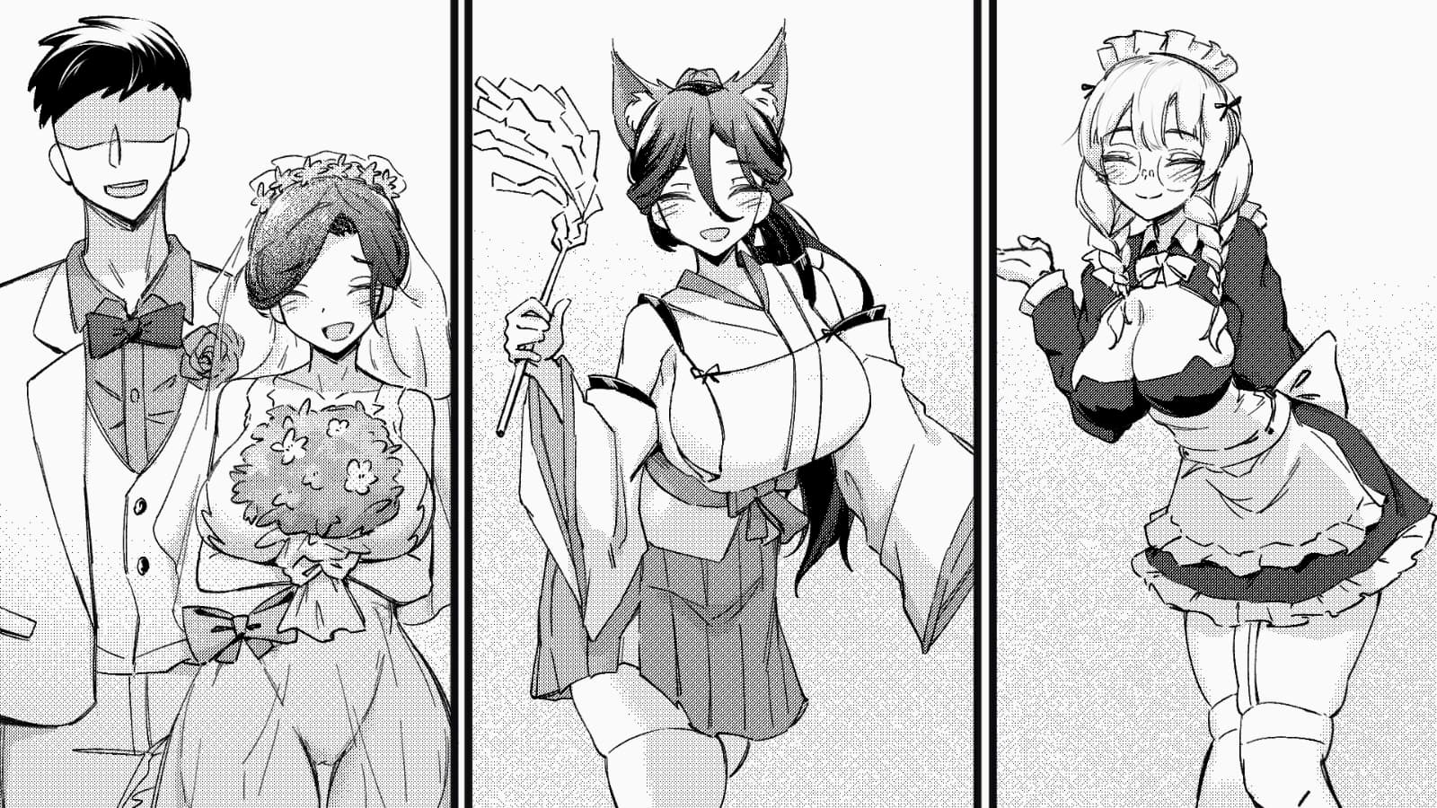 衣装の種類も結構あって、裸・エロ下着・私服・忍者・騎士・巫女・メイド・シスター・逆バニー・魔法少女の切り替えが可能です。各衣装1種の固有シーンがあり、着せ替え衣装は正常位・後背位・騎乗位の夜の夫婦活動にも反映されます。