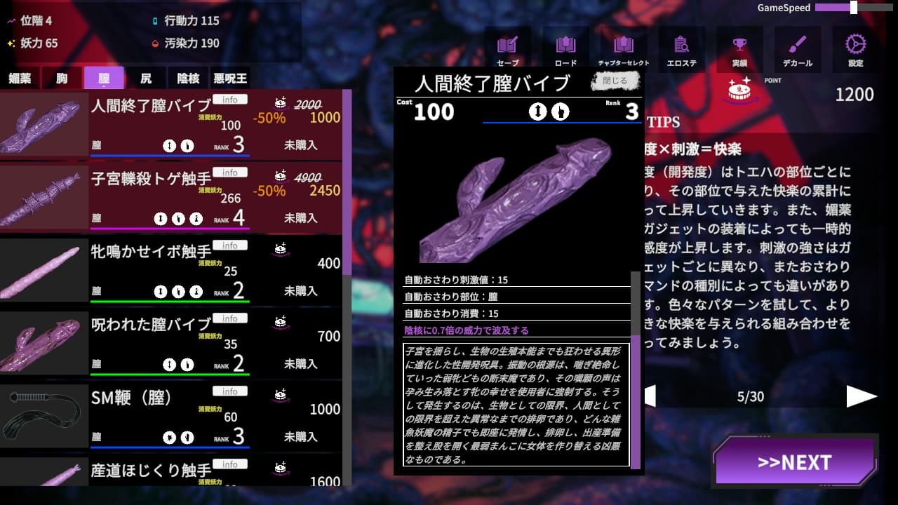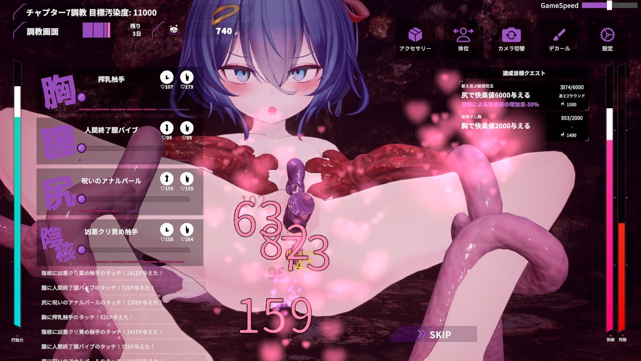 トエハの調教は4部位に対して触手やエログッズのような「ガジェット」を用いて行います。実績の形で提示される目標を達成することで手に入るポイントと引き換えに様々な手札を揃えていき、彼女を快楽調教によって堕落させます。