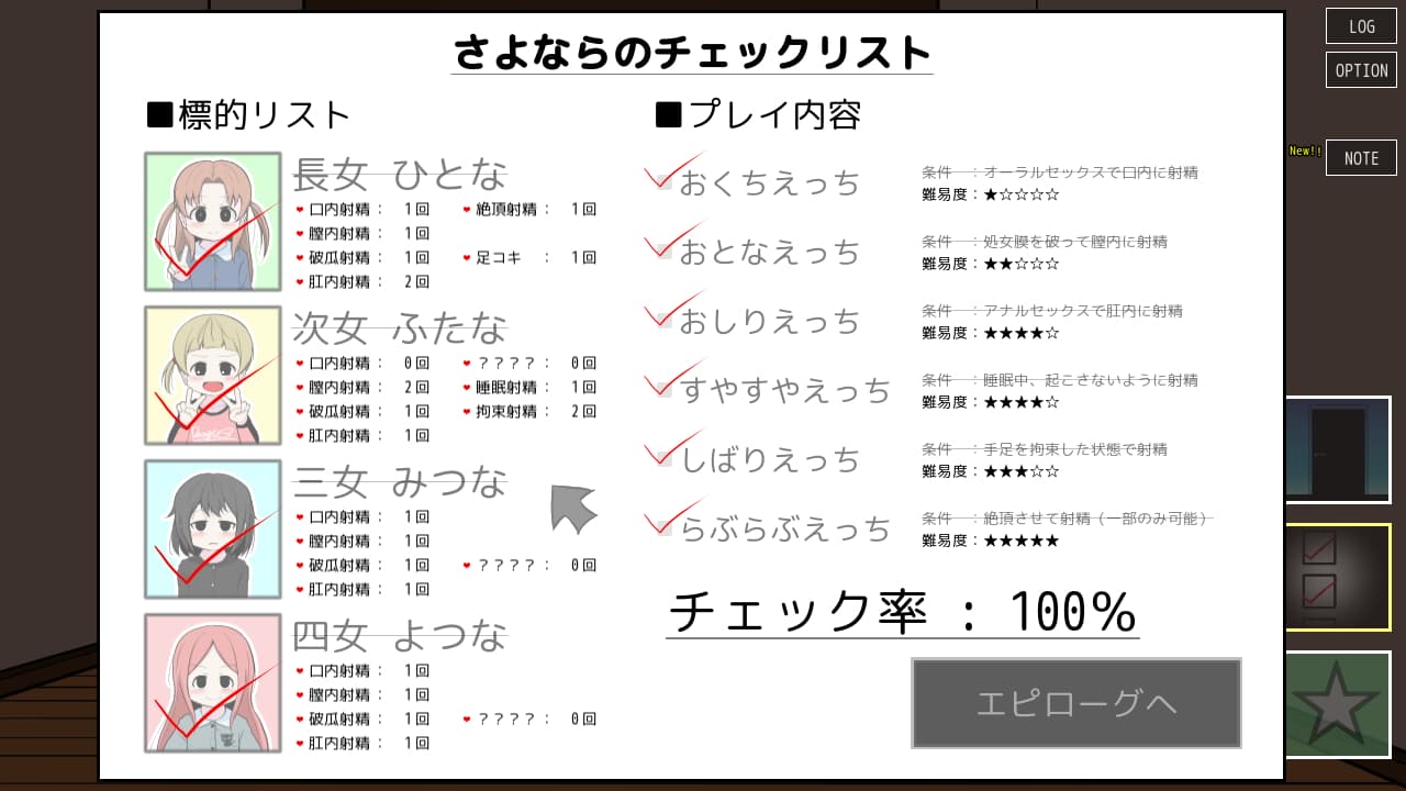 そういう知識レベルの観点で言うと長女のひとなだけは豊富な性知識がある女の子で、チェックリスト完成を目指す中で唯一ですが「らぶらぶエッチ」ができる相手です。なお、コレラブラブだったのか?と首を捻っていたららぶらぶえっちの項目にチェックマークが付いて笑ってしまう模様。