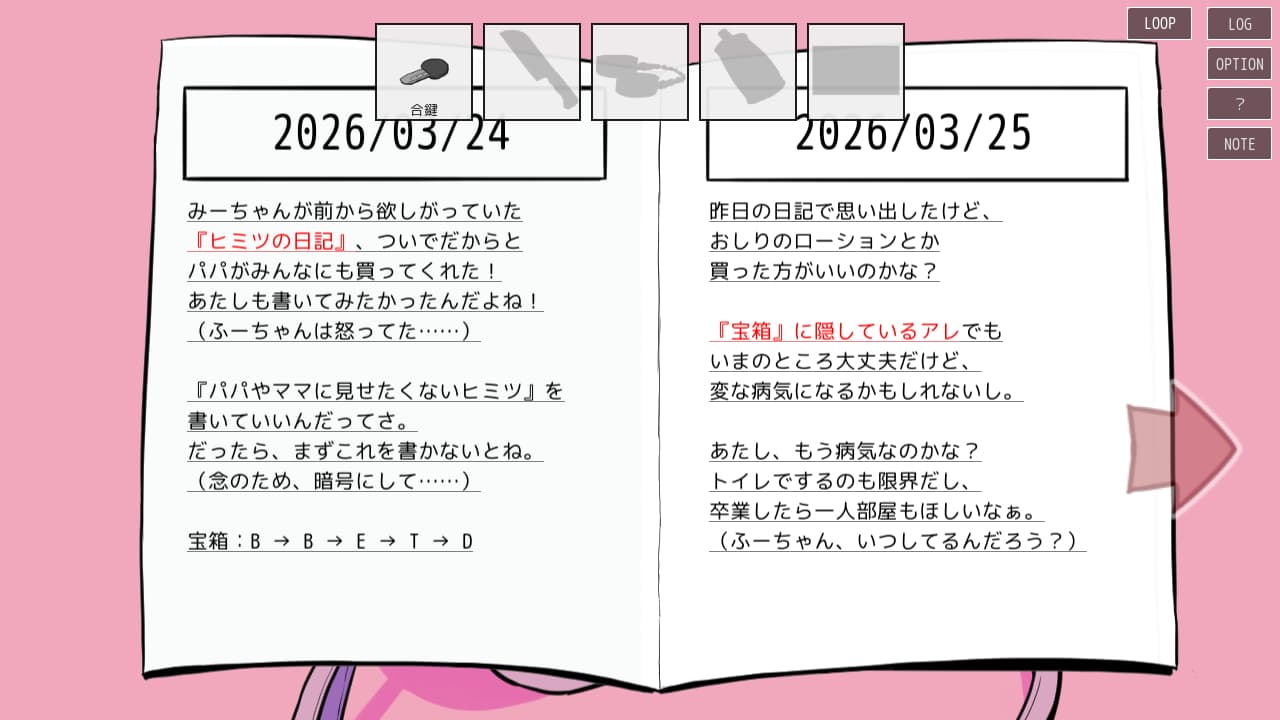 アパートの中には姉妹にアプローチするための様々な手掛かりが残されています。探索を進めていくと「NOTE」に情報が記録されているので色々な場所を調べながらパスワードを入手したり攻略法の糸口を見つけるゲームシステムです。