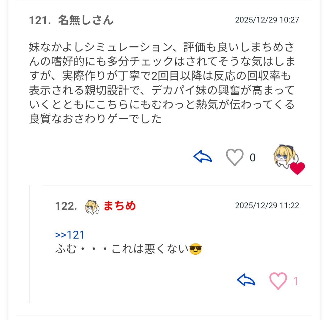 | 選評 実はRe:Sisterと上の2つの作品とを含めて「同棲SLGの心・技・体」と呼んでいる。 そうですか。次の方どうぞ~ ヒロインとの"心"の距離が詰まってゆくのを細かい表現変化でプレイヤー独自の体験へと昇華せしめた佐谷霞巳。 アニメーション・グラフィック・演出……古豪が揮う"技"が特徴のFallen。 そして妹の"体"がエロ過ぎるRe:Sister。 2025年の同棲SLG三傑だな! 明らかに"体"はこじつけだよな |