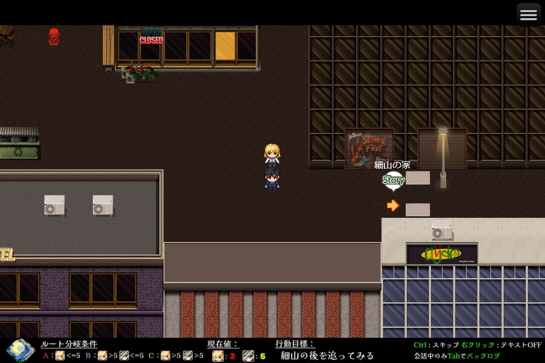ただ、ニューゲーム時に分岐直前から始めてフラグもそこで調整可能という機能があり再び面倒な共通ルートをやらなくても大丈夫なよう整備されています。更にこのゲームはイベント進行地点に歩いて会話を見るの繰り返しなのですがゲーム画面下部に次にやるべきことが書かれているのが分かりやすくて良かったです。