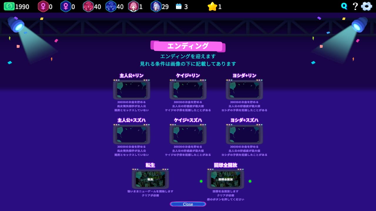 エンディング後はタイトルに戻るので事前にセーブをしておきましょう。「転生」によってスキルや所持金が引き継げます。純愛エンドを狙うなら主人公のスキルを強化(特にプレゼントと愛撫のやつ)しておきセクキャバで衣装をプレゼントしていけばすぐに好感度が999になるので周回前提ですが純愛方面は楽勝だと思います。