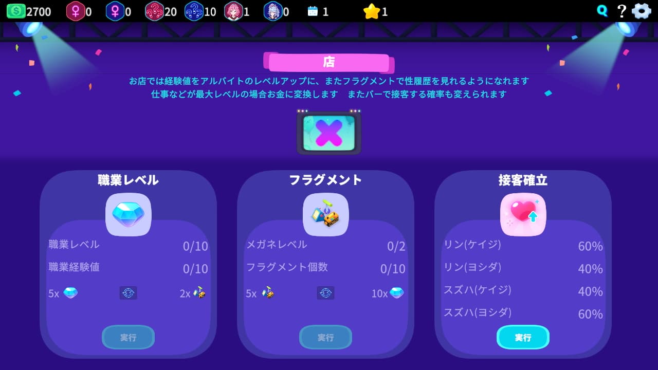 本作のセクキャバシステムは計10ターン、間男とヒロインの接客を賭けてお酒の注文合戦を行います。