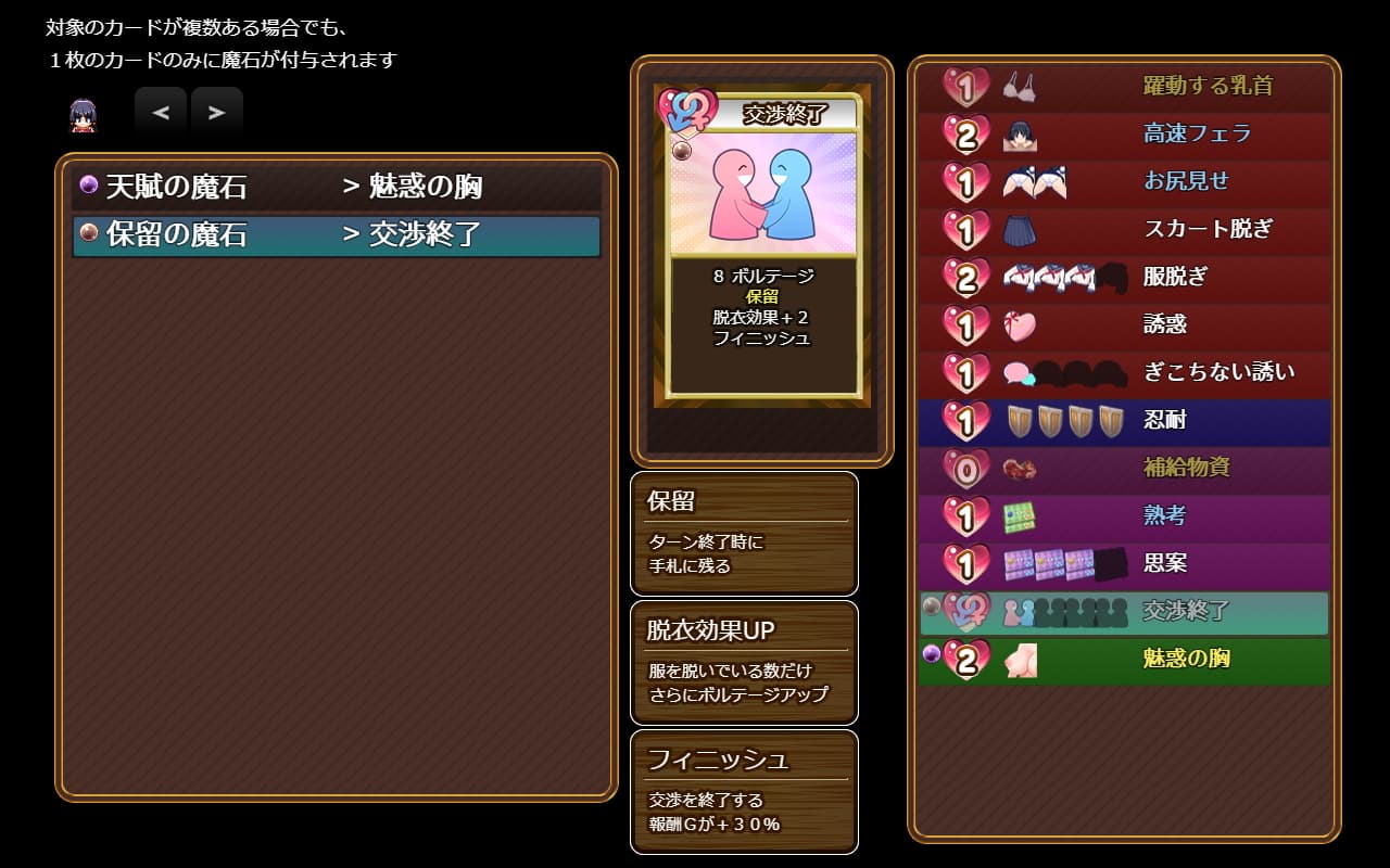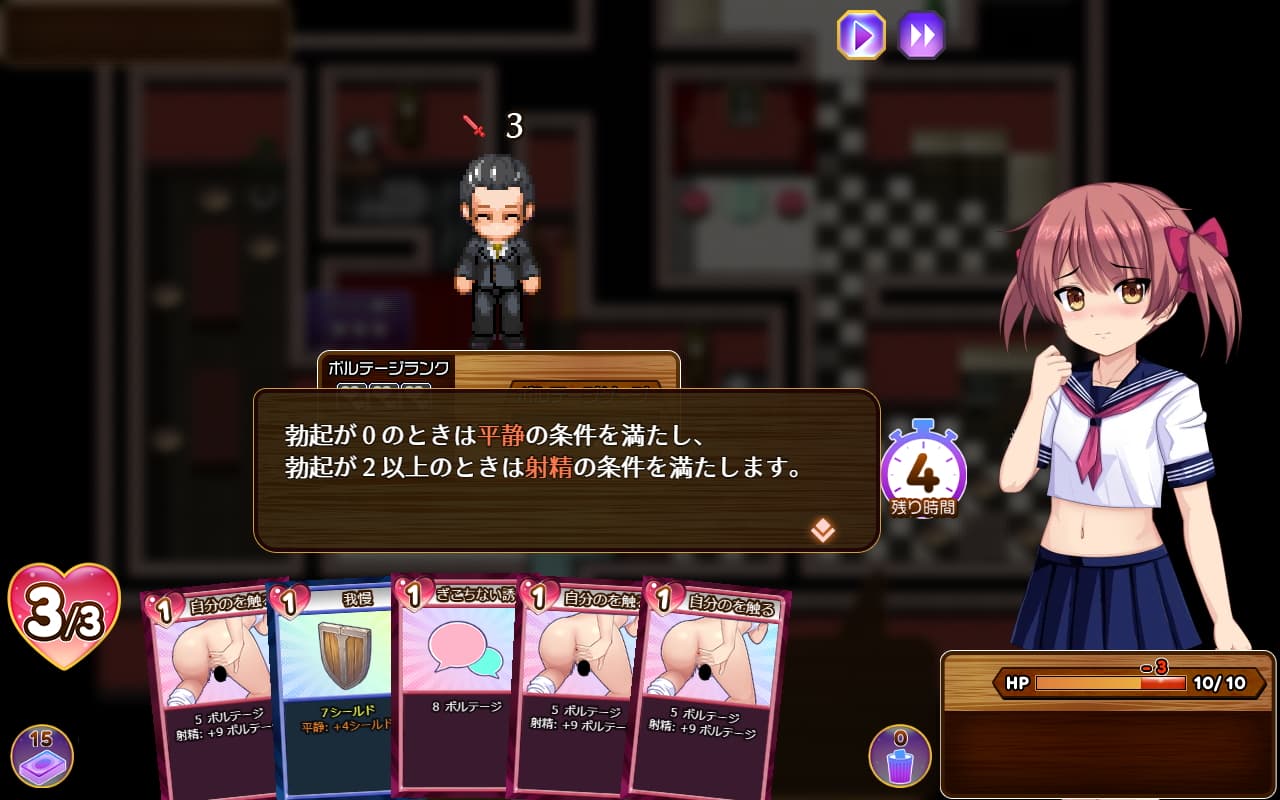 精液が必要なゲームの進行上必ず売春はする必要があるが、まあこのカードバトルをやらない簡易売春でも「売春レベル」が上がって行って、ヒロインの基礎性能がアップするしいくつかの手段でカードも手に入るからレベルが上がってから挑戦してみてもいい。