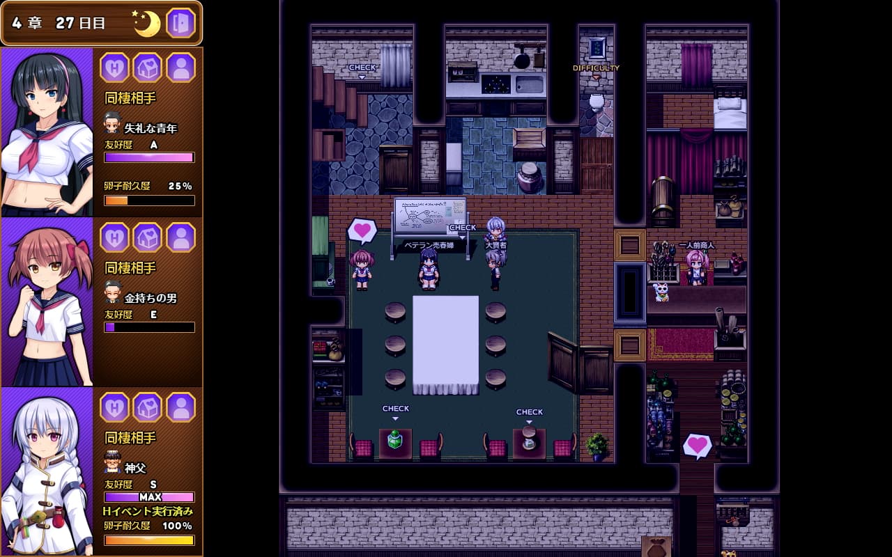 先程車の両輪と言いましたがこうしたエロ方面のメリットが手伝って実際には冒険の方は割とサクッと5章まで進められるので一通りストーリーを見たら売春カードゲームをしたり同棲相手の友好度を上げたりするのがメインになるかと思います。