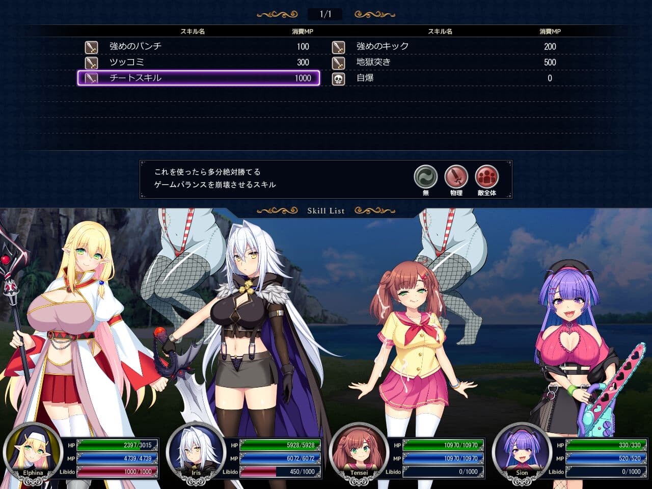 あせろら島には本編で飛空艇が手に入った段階から行けるようになると思いますが、本編終盤の敵かそれ以上に厳しい戦闘でした。周回でレベルが高い状態なら難なく攻略できると思いますけど、救済として最初に仲間になる「転生ちゃん」が初期レベルでステータスカンストしているうえに精液で強化すると敵を一撃で葬るチートスキルを覚えるため、現実的には初回プレイでもあせろら島を冒険できるようになっています。