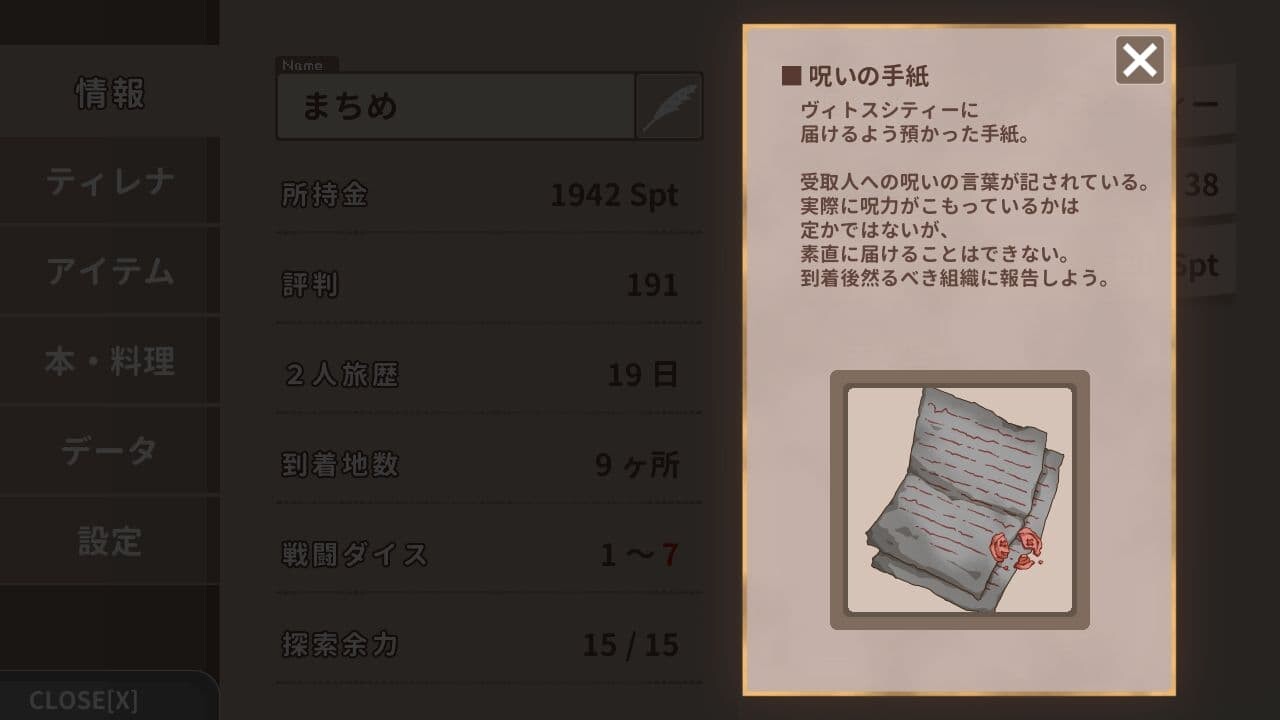 書店でレシピが売っている -到着時親密度++ -次の町まで戦闘ダイス最大値+2 |
