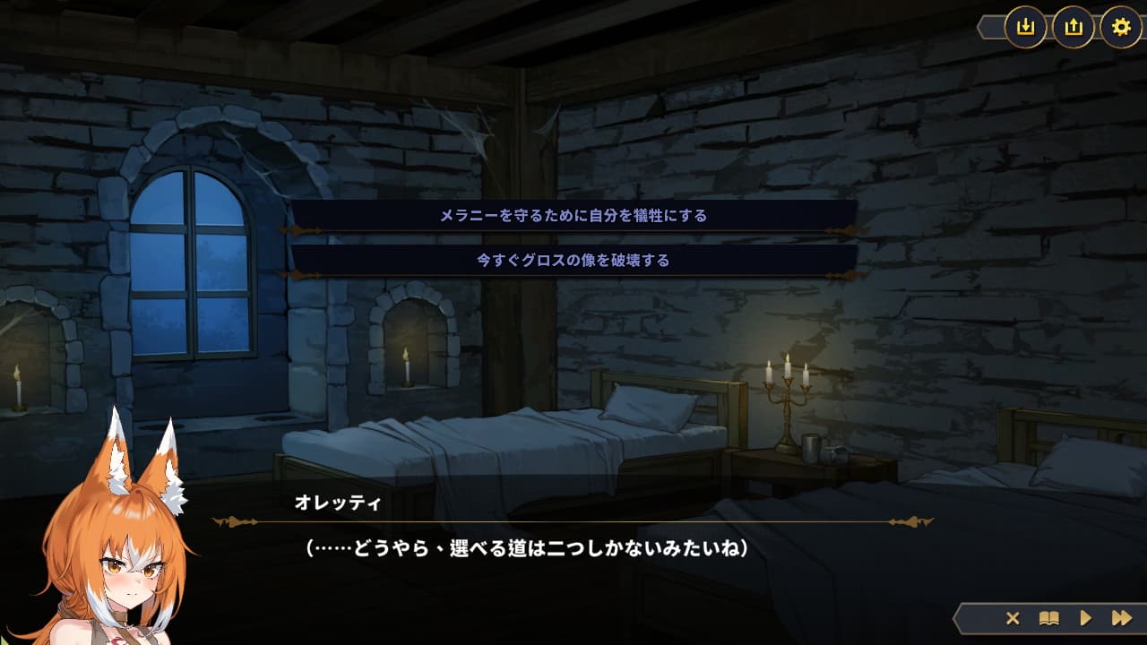ゲームパートの紹介。本作は序中盤の行動結果によって正義・中立・堕落の3ルートに分岐し7つのエンディングがオレッティの運命として提示されるものとなっています。