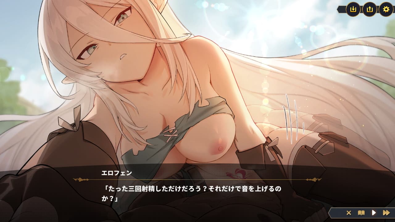 これは作中屈指のお気に入りでゲームのメインテーマとは真逆のシチュエーションだが、娼館通いで遅刻した警備兵をエロフェンがおしおきしている場面。奴隷紋が子宮付近にあるのがエロいね。こんな激強エルフ剣士ですらグロスに隷属している事実。