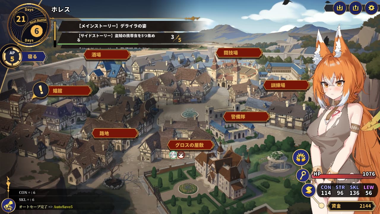 暗黒街を歩き回って様々なイベントを起こしてみたり、訓練場で自分を鍛えて備えたり、娼館で働いたり。特別なアイテムが手に入るなどの恩恵があるサイドストーリーが頻繁に発生するのでそれを追ってみるのもよいでしょう。ゲームは大体20~30日程度で決着を迎えますがその間どう過ごすかはプレイヤー次第というくらい自由です。